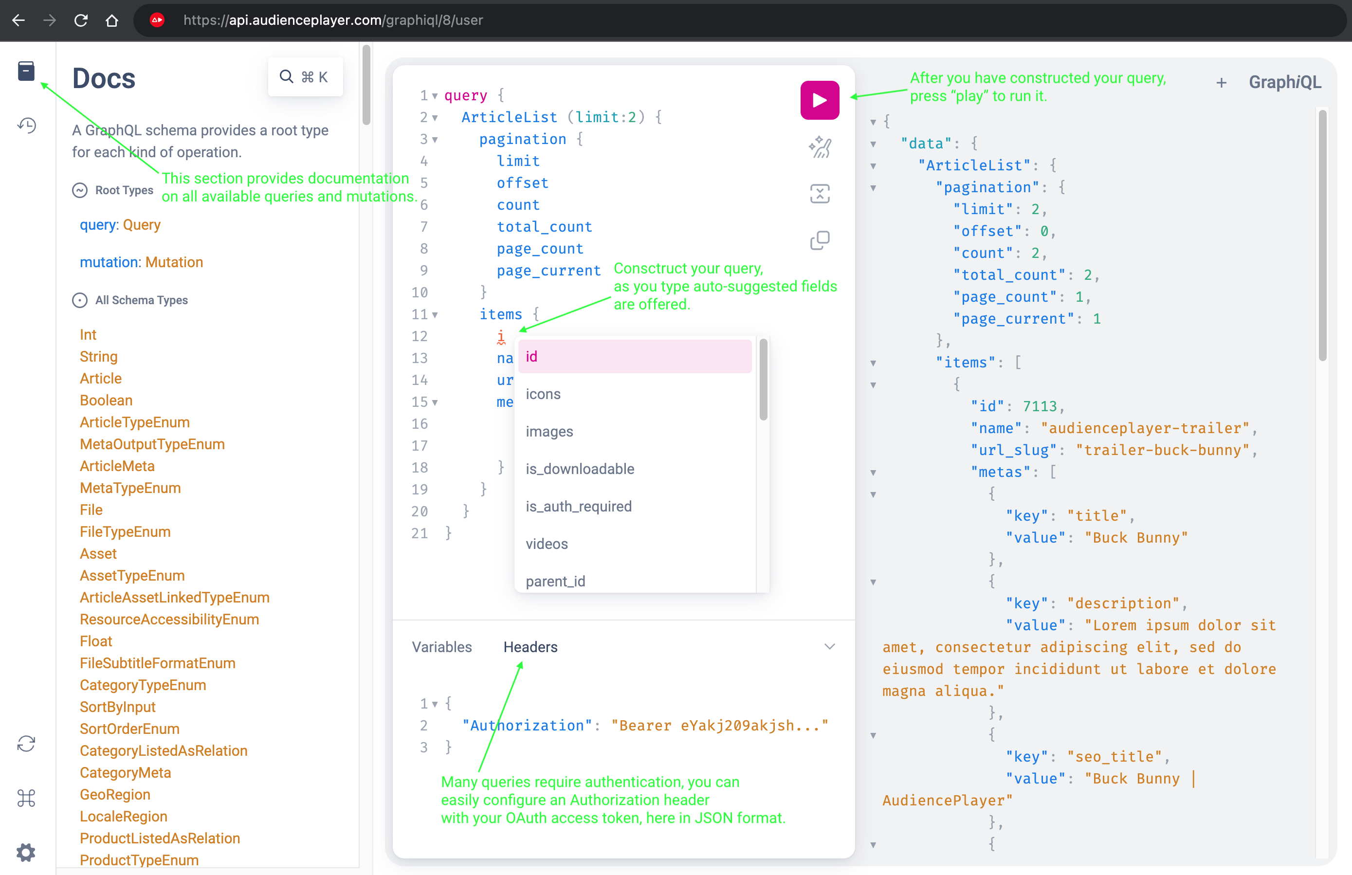 The AudiencePlayer API is based on the GraphQL specification. For more information, please see GraphQL.